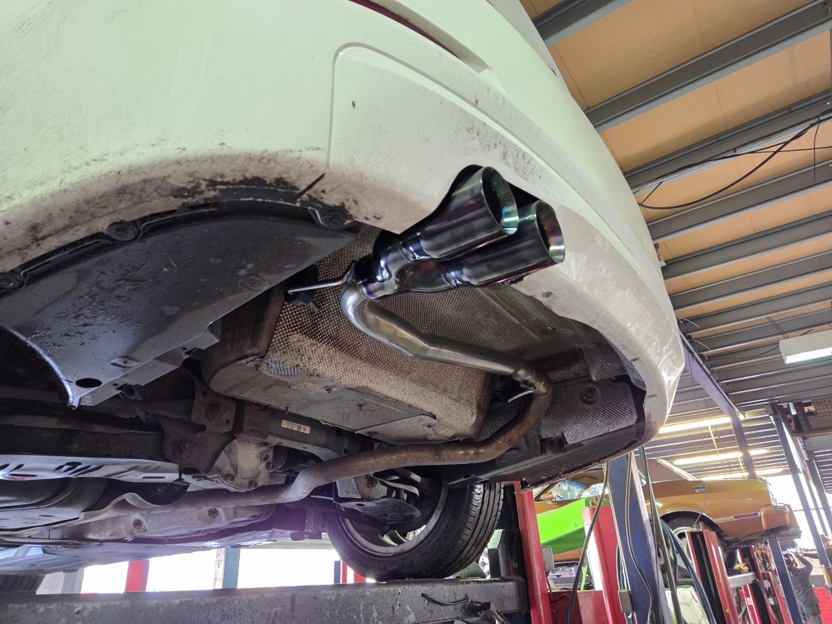 The original rear silencer was removed and replaced with a custom-fabricated rear section, designed to improve exhaust flow and give the car a more purposeful sound while keeping the rest of the system completely standard. This modification offers a noticeable change in tone without the need for a full exhaust replacement.